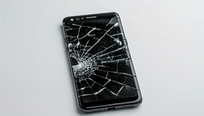 Mão segurando um celular quebrado e o texto: iphone celular: coberturas para roubo e quebra?