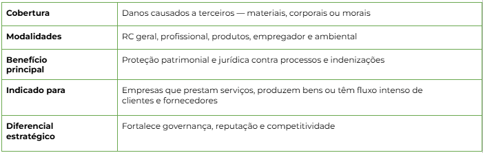 - RC Geral: cobre danos materiais e corporais causados a terceiros no local da atividade ou serviço.